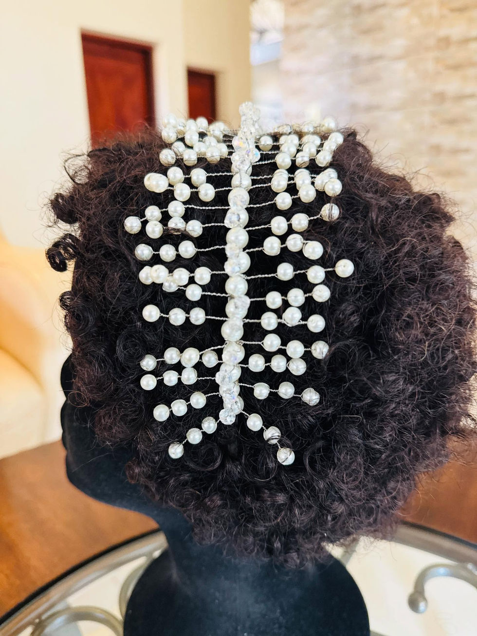 A refined headpice adorned with delicately hand-wired pearls and crystal accents, forming a scupltural, crown-like silhouette. Elegant yet modern, it frames the head beautifully, adding luminous detail and timeless sophistication, perfect for weddings, soirées, and elevated ocaasion wear.